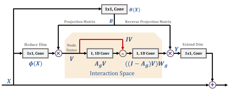 其实,和 GloRe 同一时期的相关工作还有 SGR[10], Beyonds Grids[11] 和 LatenGNN[13]。它们都采取三步走的策略,即映射、GCN 和反映射。他们的区别在于每一步的具体操作。