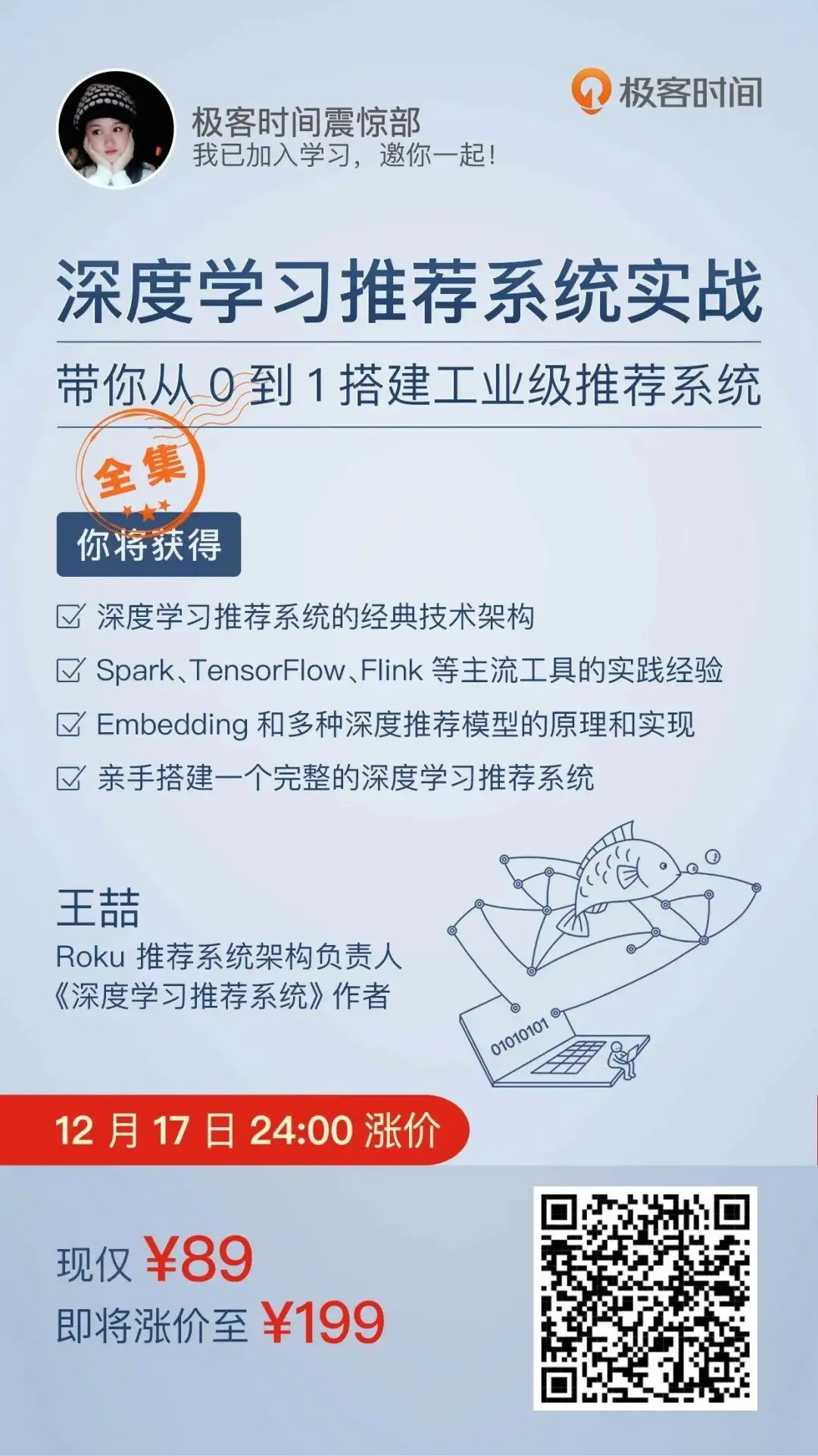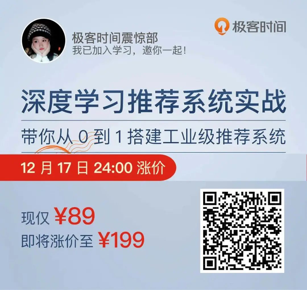 以上这些在内的,一整套深度学习推荐系统。不说它能支撑起一个中大型公司的推荐系统,但是毫无疑问,它可以成为一个 工业级推荐系统的种子项目。而这一切,都能在课程里,一步步尝试搭建起来。