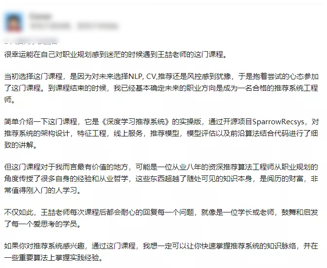 可以说,王喆老师的书也好,课也好,从未叫人失望过,而且他人也特别 nice,经常在专栏下面跟读者留言互动,这种耐心和责任心,真不是一般人有的。这里分享一位粉丝的留言: