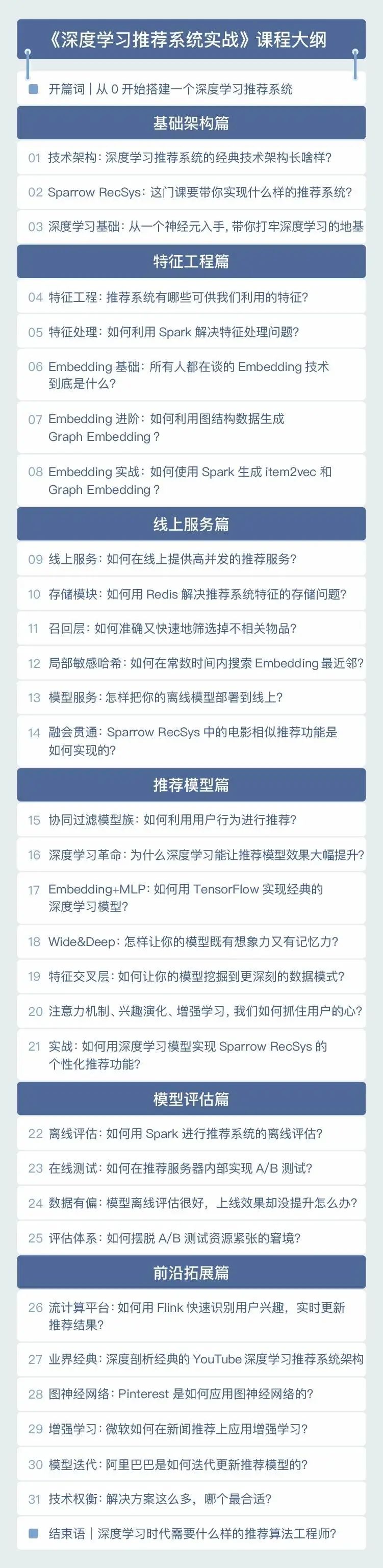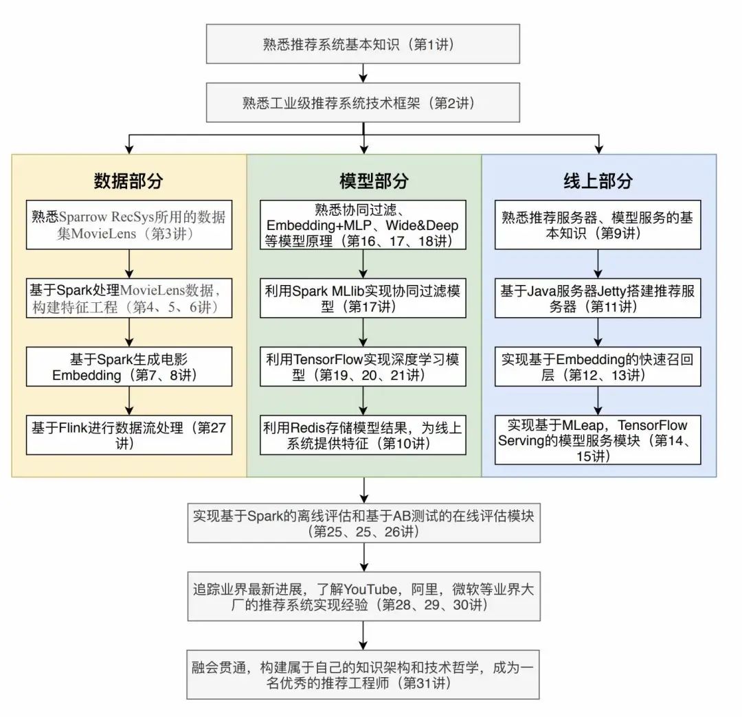 基础架构篇: 讲要从 0 开始实现的推荐系统, Sparrow RecSys 的主要功能和技术架构,也会用到 Spark、Flink、TensorFlow 等业界最流行的机器学习和大数据框架。