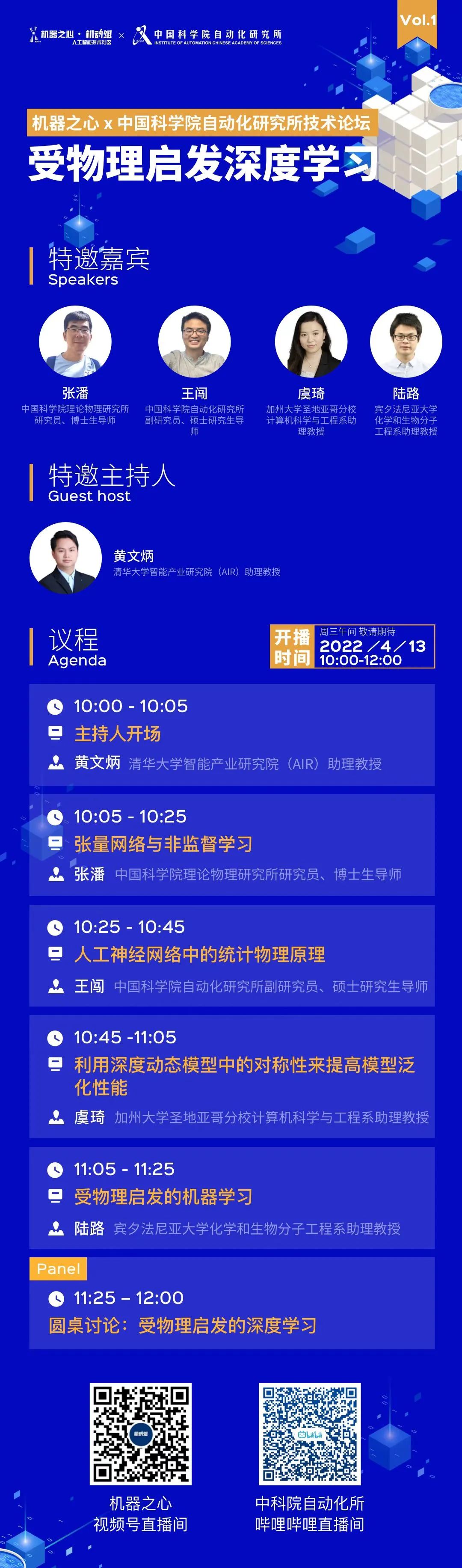 4月13日10:00 - 12:00,「机器之心 x 中科院自动化所技术论坛」第一期在线上举办,以「受物理启发的深度学习」为主题,特邀清华大学智能产业研究院(AIR)助理教授黄文炳主持,多位领域专家做技术分享,聚焦受物理启发的深度学习,核心受众为机器学习领域硕博研究生。