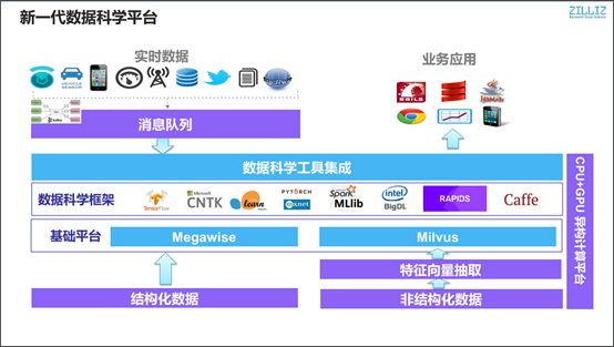 接下来是ZILLIZ对新一代数据科学提出的解决方案,我们的两个产品分别是MegaWise和Milvus,这两个产品分别是对应前面讲到的两部分——数据化和数据现实,通过这种数据科技的整合,可以把以前比较慢的工作、或者一些算法的训练、以及数据计算的工作进行加速,然后能够对实时数据进行处理,这就是我们公司主要的两款产品。