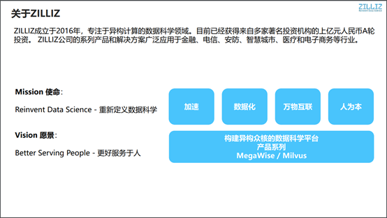 首先简单介绍一下ZILLIZ,公司成立于2016年,专注于异构计算的数据科学领域。公司的使命是Reinvent Data Science,即通过使用异构加速这种新的计算模式,解决数据科学领域的难点和痛点。
