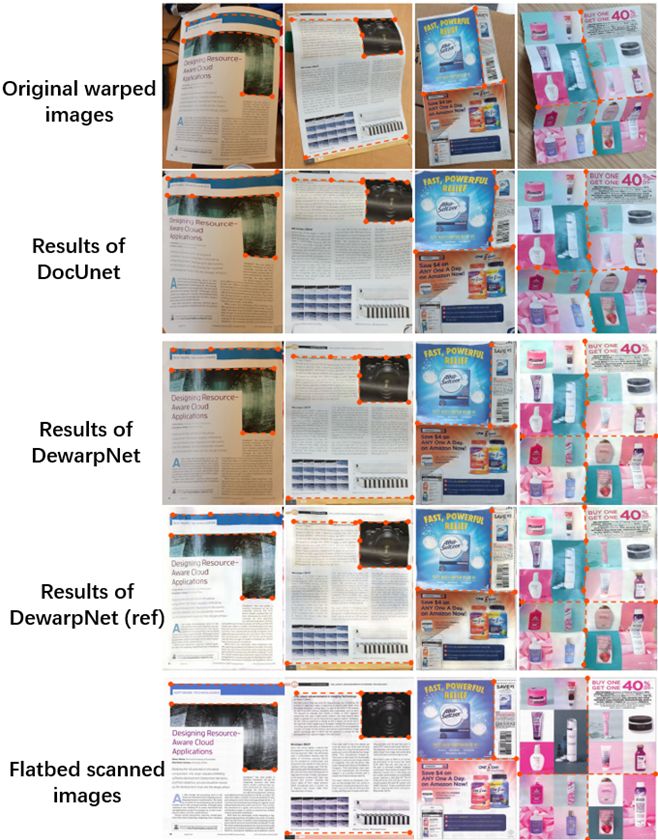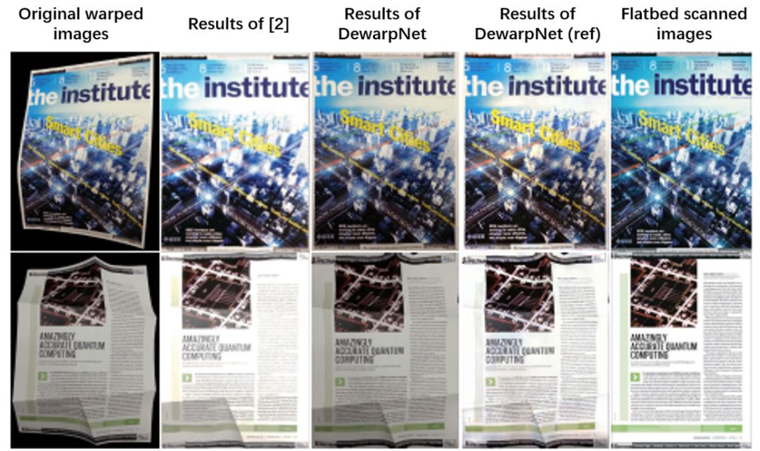 纸质文档在我们生活中十分重要且常见,上面具有丰富的信息。而数字文档则易于存储、传播以及检索。如今移动摄像头拍摄文档图像是方便且常见的文档数字化方法,但得到的图像由于纸张的物理形变、相机拍摄角度和光照条件多变的原因,不利于自动化信息提取和内容分析。有的研究通过低维的模型来对文档的形变进行建模,这是较难实现的;还有的研究直接假定一个网格(Mesh)对形变图像进行表征,然后直接预测网格上每个顶点对应于输出图像的位置,但很多都需要额外的硬件设备或多角度图像,而且计算量大且费时。近期的研究[1]中虽然提出了更快的方法,但由于训练数据只包含2维形变信息,所以对真实图片测试效果不鲁棒。