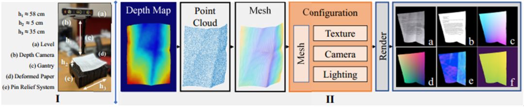 图2是文章提出的数据采集方法的流程,主要分为I和II两个阶段。在I阶段,作者利用一个工作台,得到真实纸张的Depth Map,工作台关键部件有深感相机(用于拍摄纸张的深度图)、针浮雕系统(Pin Relief System,含有64个独立的针,可以改变纸张不同位置的高度,实现多种形变并保持)。有了Depth Map后,通过相机的参数可以直接计算得到Point Cloud。计算点云时作者对同一图拍了6张并取平均以减少零均值噪声(Zero-mean Noise),同时用一些算法对点云进行平滑处理。之后用球旋转算法(Ball Pivoting Algorithm)[3]得到网格,下采样为100x100大小。为网格中每个顶点指定UV坐标,便于后续渲染。之后还对网格进行了旋转、裁剪(裁剪后插值回100x100)的增广操作。贴图渲染过程中,综合改变贴图内容、角度、光照、背景。最终每张图都可以生成3D Coordinate Map, Depth Map, Normals, UV Map, Albedo Map标注信息。