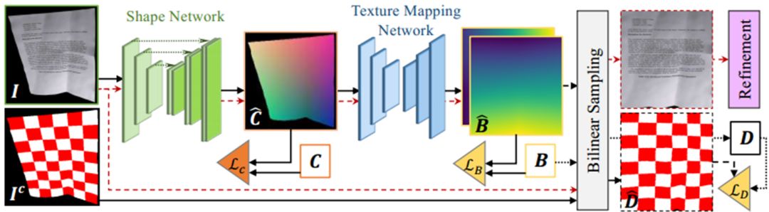 DewarpNet主要包含两个子网络Shape Network和Texture Mapping Network。前者为一个U-net[4]网络,以原图I∈Rh×w×3作为输入,预测3D Coordinate Map Ĉ∈Rh×w×3(每个像素的值是一个三维向量,代表纸张该点的空间坐标)。后者为由多个DenseNet Block[5]构成,以Ĉ 作为输入,预测Backward Mapping B̂∈Rh×w×2(每个像素的值是一个二维向量,代表I的像素在矫正后图像中的位置),因为该子网络实现了3维坐标到2维坐标的转换,作者使用了在坐标转换任务中能提高泛化能力的Coordinate Convolution (CoordConv)[6]。Ic是I以棋盘图案为贴图内容时生成的图像,模型预测出的B̂作用于Ic得到预测D̂∈Rh×w×3,这一做法的目的是让损失函数LD(见下文)损失函数不受贴图内容的影响,使得模型对形变相同但贴图内容的不同的图像的矫正参数是相同的,Ic只用在训练过程中。训练的损失函数为,其中