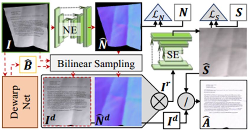 后处理网络对矫正后图像Id的光照情况进一步优化,提高了视觉质量和OCR性能。网络包含两个U-net网络,一个U-net以原图I作为输入,预测Surface Norm N̂∈Rh×w×3。N̂矫正后得到N̂d。另一个U-net以Id和N̂d作为输入,预测Shading Map Ŝ∈Rh×w×3(表征了图像的光照情况和颜色),利用Id和Ŝ可运算得到去阴影的图像Â(具体计算过程可见论文的补充材料)。