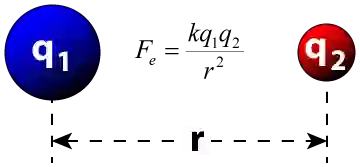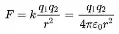 好了,从更深层次理解了静电力遵循平方反比定律后,要猜出静电力的公式就是很简单的事情了。因为很明显的,两个电荷之间的静电力肯定跟两者的电荷量有关,而且还是电荷越大静电力越大,加上距离平方反比规律,两个电荷之间的静电力大致就是下面这样的了: