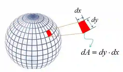 如上图,我们把一个球面分割成了很多块,这样每一个小块就变成了一个长为dx,宽为dy的小方块,这个小方块的面积da=dx·dy。如果这个小块的电场强度为E,那么通过这个小块的电通量就是E·da。如果我们我们把这个球面分割成了无穷多份,那么把这无穷多个小块的电通量加起来,就能得到穿过这个曲面的总电通量。
