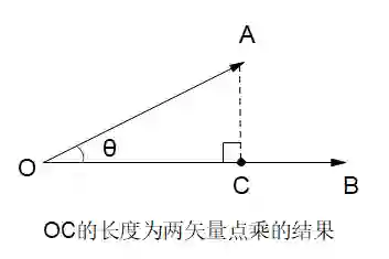 如上图,我们有两个矢量OA和OB(线段的长短代表矢量的大小,箭头的方向代表矢量的方向),我们过A点做AC垂直于OB(也就是OA往OB方向上投影),那么线段OC的长度就代表了矢量OA在OB方向上的投影。而根据三角函数的定义,一个角度θ的余弦cosθ被定义为邻边(OC)和斜边(OA)的比值,即cosθ=OC/|OA|(绝对值表示矢量的大小,|OA|表示矢量OA的大小)。所以矢量OA在OB方向上的投影OC可以表示为:OC=|OA|×cosθ。