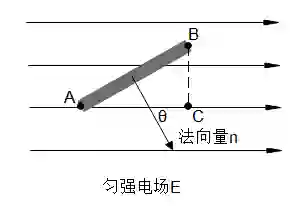 然后,我们再来谈一谈曲面的方向,可能很多人都认为曲面的方向就是定义为AB的方向。其实不是的,我们是用一个垂直于这个平面的向量的方向表示这个平面的方向,这个向量就叫这个平面的法向量。如上图所示,我画了一个跟木板垂直的法向量n,那么这个法向量n和电场E的夹角才是木板这个平面和电场的夹角θ。