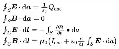 至此,麦克斯韦方程组的四个方程:描述静电的高斯电场定律、描述静磁的高斯磁场定律、描述磁生电的法拉第定律和描述电生磁的安培-麦克斯韦定律的积分形式就都说完了。把它们都写下来就是这样: