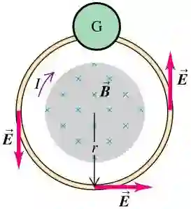 如果我们从上往下看的话,这个成闭环的感生电场就是如下图所示:它在这个闭环每点的方向都不一样,这样就刚好可以沿着回路驱动带电粒子,好像是电场在推着带电粒子在这里环里流动一样。