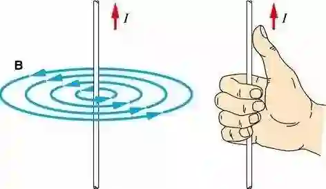 如上图,假设电流从下往上,那么它在周围就会产生这样一个环形的磁场。磁场的方向可以用所谓的右手定则直观的判断:手握着导线,拇指指向电流的方向,那么你右手四指弯曲的方向就是磁场B的方向。