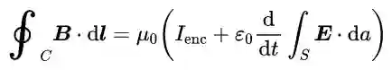 没错,电场强度越来越大,那么通过这个曲面的电通量也就越来越大。因此,我们可以看到虽然没有电流通过这个曲面,但是通过这个曲面的电通量却发生了改变。这样,我们就可以非常合理地把“变化的电通量”这一项也添加到产生磁场的原因里。因为这项工作是麦克斯韦完成的,所以添加了这一项之后的新公式就是麦克斯韦方程组的第四个方程——安培-麦克斯韦定律: