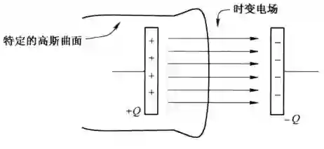 我们再来想一想,电容器在充电的时候电路中是有电流的,所以它周围应该是会产生磁场的。但是,当我们选择下面那个大口袋形的曲面的时候,并没有电流穿过这个曲面。那么,到底这个磁场是怎么来的呢?