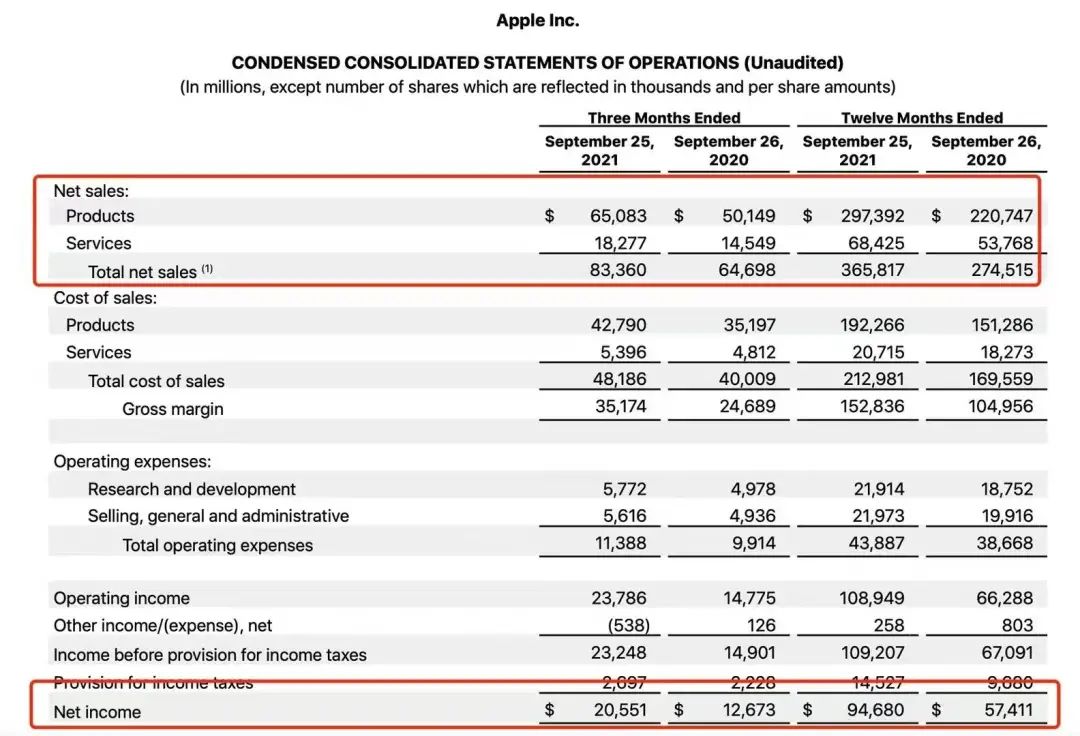 其中,每个销售类别的同比增长都超过了20%,其中iPhone以39%的增长率领先。服务类别的增长主要由高利润的订阅收入组成,其收入增长了27%,比前一年的16%有了明显的提升。