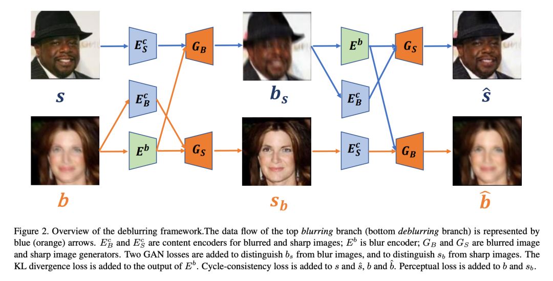 感知损失中使用模糊图像 b 而不是锐利图像作为参考图像有两个主要原因。首先,假设 b 的内容信息可以由预训练的 CNN 提取。其次,由于 s 和 b 未配对,因此在 s 和之间应用感知损失将迫使