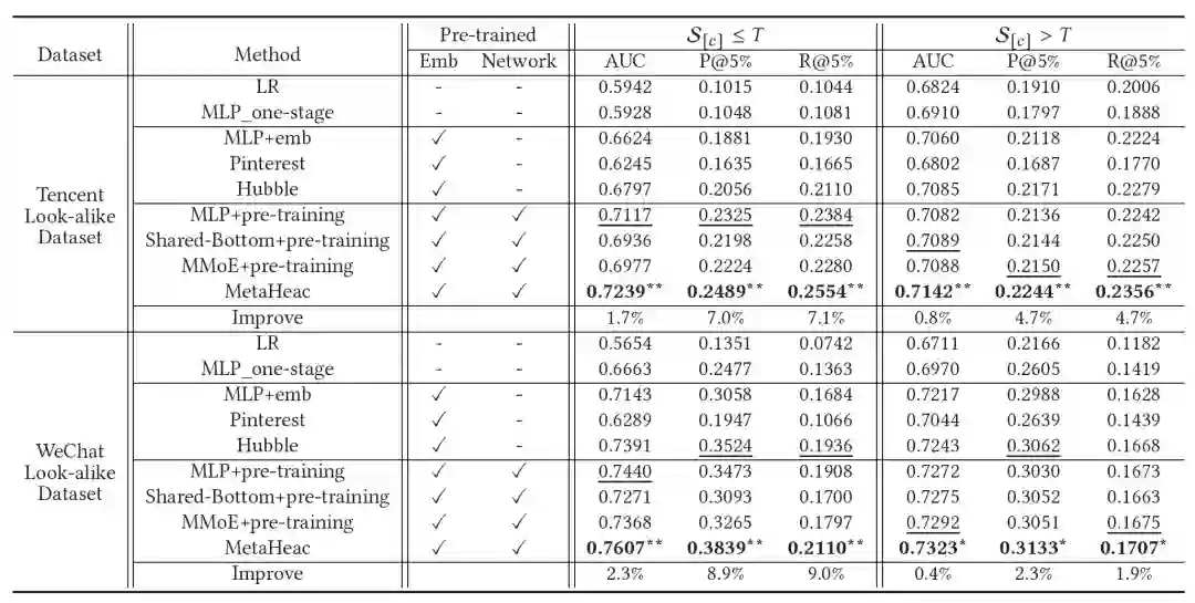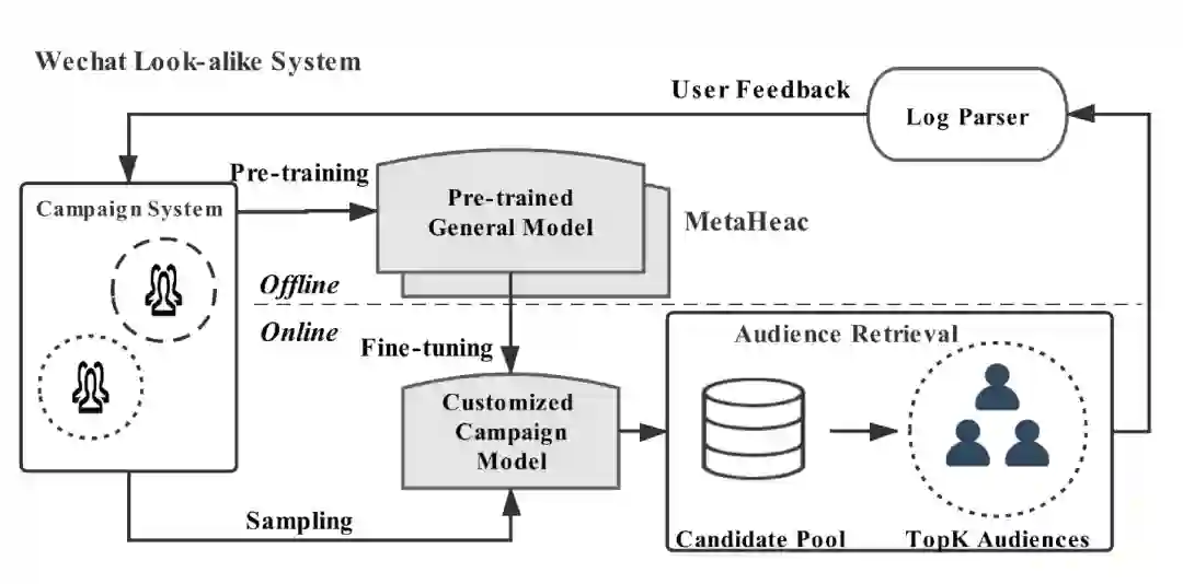 为了解决推荐系统和广告平台中的内容定向推广问题,我们提出了一个新的框架MetaHeac。在离线阶段,我们基于元学习的方法,训练得到了一个可以抓取任务间关系的通用模型。在线上阶段,我们基于给定的种子集合微调通用模型,可以很容易得到针对此种类内容推广任务的一个定制化的模型,用以寻找潜在候选用户。