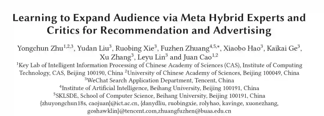 然而,look-alike建模通常面临两个挑战:(1)一个系统每天可能需要处理成百上千个不同种类的内容定向推广实例(例如体育、政治、社会等不同领域的内容定向推广)。因此,我们很难构建一个通用的方法,同时在所有内容领域中扩充高质量的受众候选集。(2)一个内容定向推广任务的受众种子集合可能非常小,而一个基于有限种子用户的定制化模型往往会产生严重的过拟合。为了解决以上的挑战,我们提出了一种新的两阶段框架Meta Hybrid Experts and Critics (MetaHeac)。