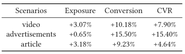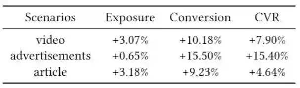 我们在大规模真实系统中的视频内容定向推广、广告推广、文章内容定向推广三个场景进行了实验,转化率都有显著提升,如下图所示。