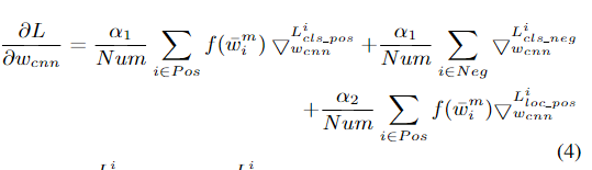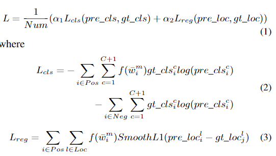 样本加权损失L由用于边界框分类的损失Lcls和用于边界框回归的损失Lreg组成,Lcls使用softmax损失函数而Lreg使用L1平滑损失实现。