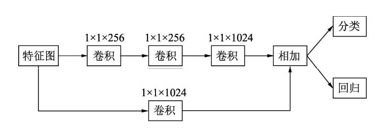 在得到特征图后,DSSD也改进了分类与回归的预测模块。SSD的预测模块是直接使用3×3卷积,而DSSD则对比了多种方法,最终选择了下图所示的计算方式,包含了一个残差单元,主路和旁路进行逐元素相加,然后再接到分类与回归的预测模块中。