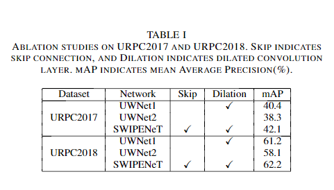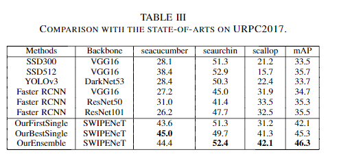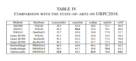 在两个水下机器人拾取竞赛数据集URPC2017和URPC2018进行的实验表明,与几种最先进的目标检测方法相比,本文提出的SWIPENet+IMA框架在检测精度上取得了较好的性能。