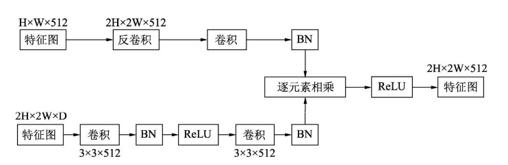 DSSD具体的反卷积模块如下图所示。这里深特征图的大小是H×W×512,浅特征图的大小为2H×2W×D。深特征图经过反卷积后尺寸与浅特征图相同,再经过一些卷积、ReLU与BN操作后,两者进行逐元素的相乘,最后经过一个ReLU模块,得到最终需要的特征图。