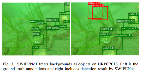 SWIPENet可能会丢失或错误地检测到训练集中的某些对象,这些目标对象可能被视为噪声数据。这是因为含有噪声的数据非常模糊,并且与背景相似,因此容易被忽略或检测为背景。如果我们使用这些嘈杂的数据训练SWIPENet,则性能可能会受到影响, SWIPENet无法将背景与物体区分开来。图3显示了示例测试图像及其通过SWIPENet的不正确检测。