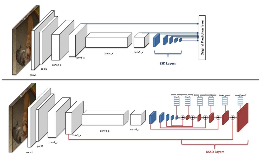 可以看出,DSSD通过多个上采样反卷积层增强了SSD目标检测框架,以提高特征图的分辨率。在DSSD体系结构中,首先,构造多个下采样卷积层以提取有利于对象分类的高语义特征图。经过几次下采样操作后,特征图太粗糙而无法提供足够的信息来进行精确的小对象定位,因此,添加了多个上采样反卷积层和skip connection来恢复特征图的高分辨率。但是,即使恢复了分辨率,下采样操作丢失的详细信息也无法完全恢复。
