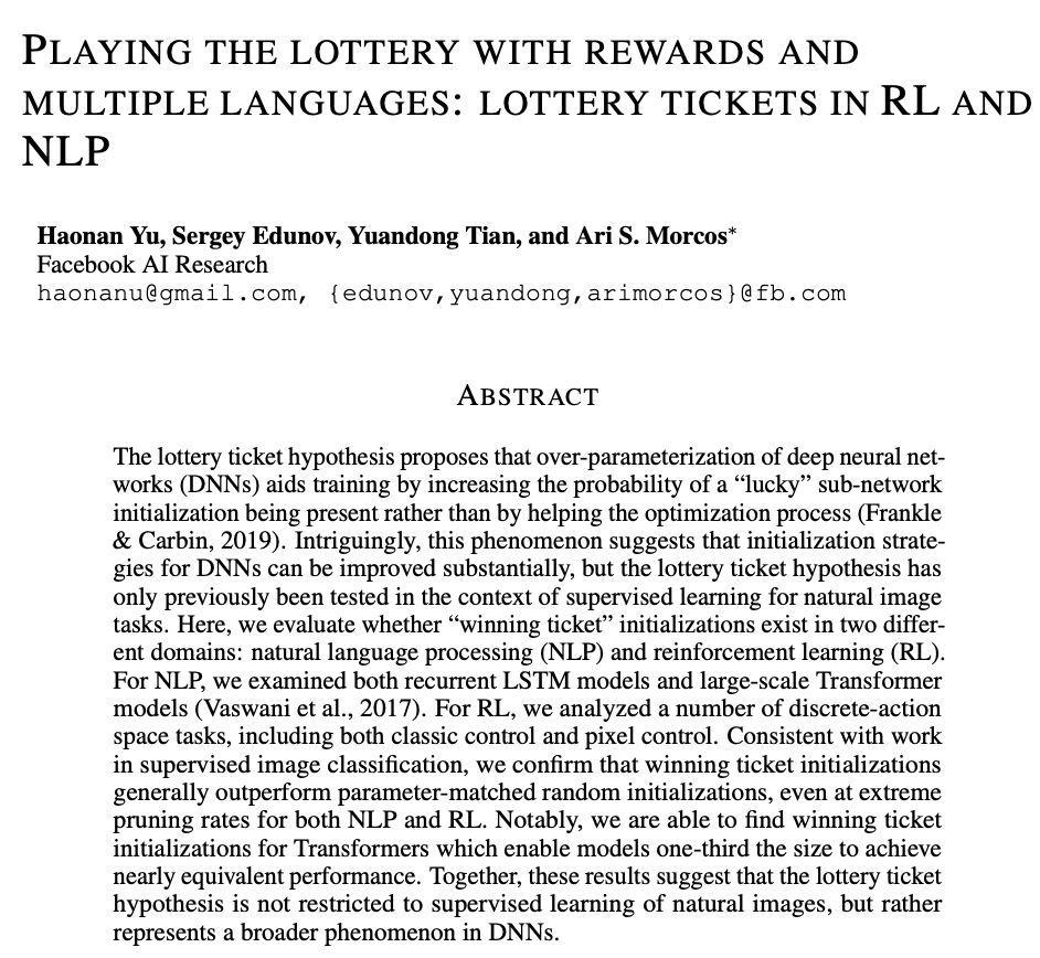 在最近的论文“Playing the lottery with rewards and multiple languages: lottery tickets in RL and NLP”中,我们研究了这些问题,发现彩票现象也存在于强化学习(RL)和自然语言处理(NLP)领域。对于RL,我们分析了一组经典的控制任务和Atari游戏;对于NLP,我们研究了经典的长短时记忆(LSTM)语言模型和最近的为机器翻译训练的Transformer模型。