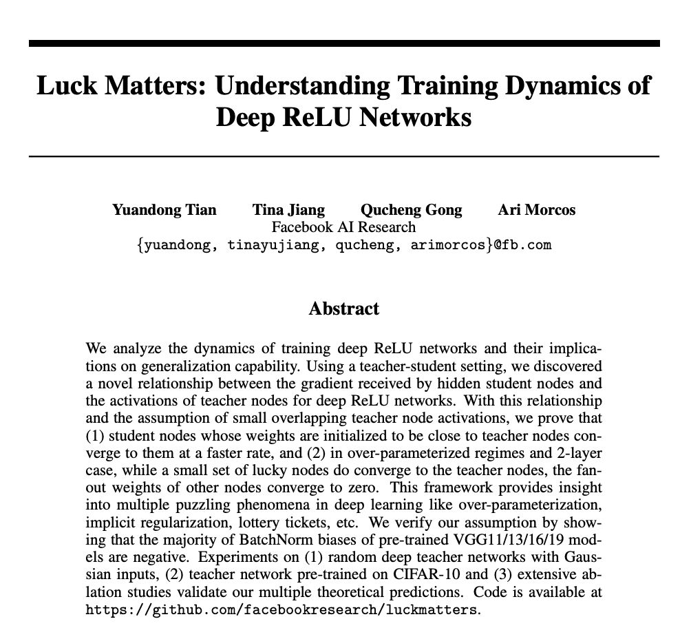 在论文“Luck Matters: Understanding Training Dynamics of Deep ReLU Networks”的分析中,我们发现这种现象发生在一个2层的ReLU网络中:如果一个学生神经元的初始权重碰巧与某些教师神经元的权重相似,那么就会出现专门化。神经网络的大小很重要,因为学生网络越大,越有可能存在一个学生神经元与教师神经元的距离很接近,从而在训练中模仿教师神经元的活动。更重要的是,如果一个学生神经元的初始激活区域与一个教师神经元有更多的重叠,那么这个学生神经元的就会更快地专业化。这一行为证实了彩票假设,该假设同样提出,在神经网络中存在一些幸运的初始化子集,“中奖彩票”就是幸运的学生神经元,它们恰好在训练开始时处于正确的位置。