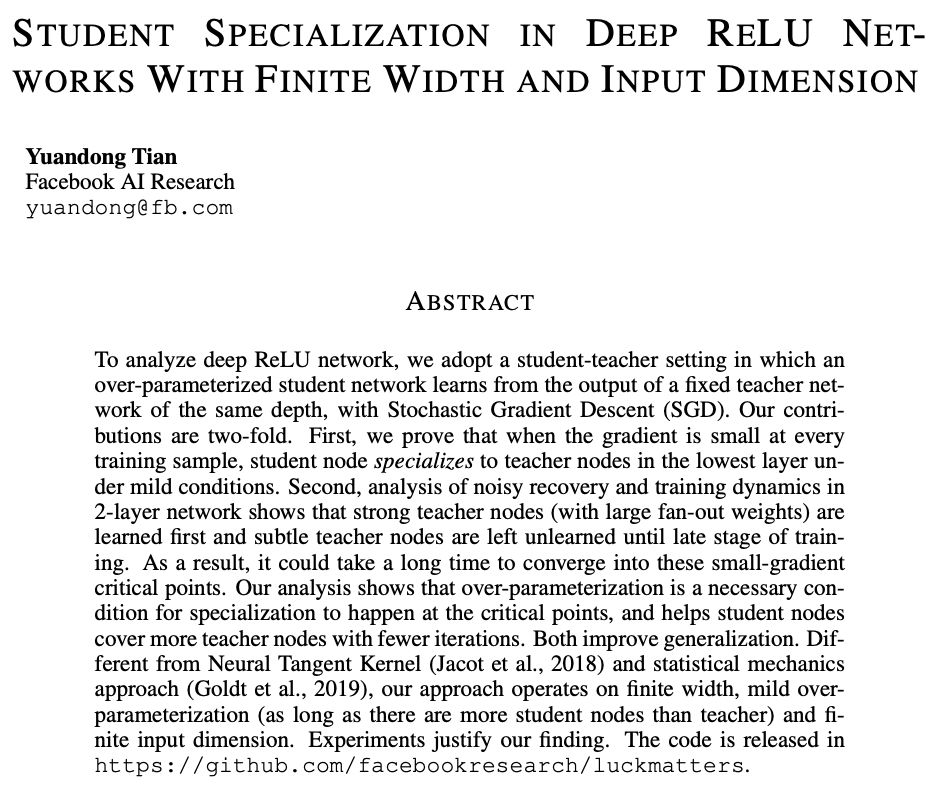 在我们的后续研究论文“Student Specialization in Deep ReLU Networks With Finite Width and Input Dimension”中,我们通过消除多种数学假设(包括独立激活和局部性)来强化我们的结果,并且仍然证明了学生专业化在经过训练后发生在深层ReLU网络的最底层。从我们的分析中,我们发现训练动态中的某些数学性质与彩票现象产生了共鸣:那些在初始化时具有轻微优势的权重,在训练收敛后成为中奖彩票的可能性更大。