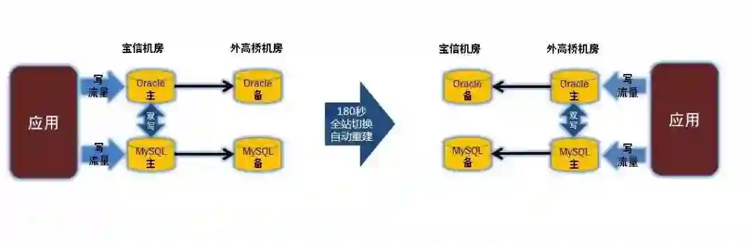 迁移完成之后,陆金所每 3 个月会通过数据库一键切换平台把全站数据库写库更换一次,一键切换平台在 180 秒完成全站数百套数据库的跨机房切换后,数千张表的 O 和 M 双写同步会自动重建,并确保数据一致性和完整性。(陆金所跨机房切换的具体实践可以参看 InfoQ 之前发布的文章《陆金所机房一键切换平台建设》)