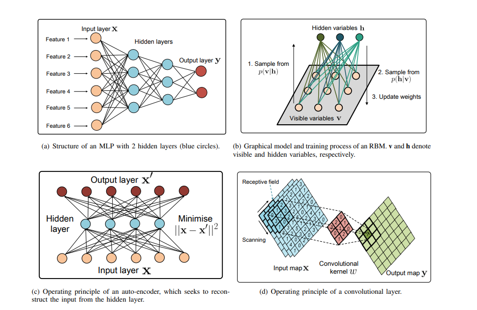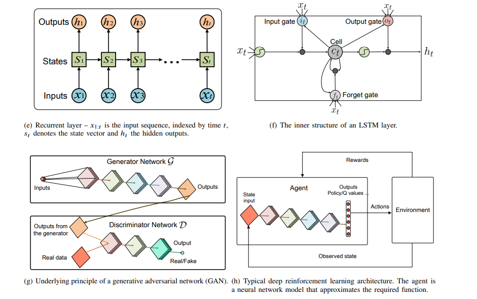 MLP、RBM、AE、CNN、RNN、LSTM、GAN、DRL的典型结构和工作原理。