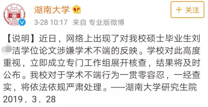 作为弱势群体的作者,在与湖南大学沟通无果后,选择了在微博发布文章维权,在作者发布微博后的一天,该剽窃论文从知网撤销,湖南大学在其官网微博账号发表申明称,会严肃处理。