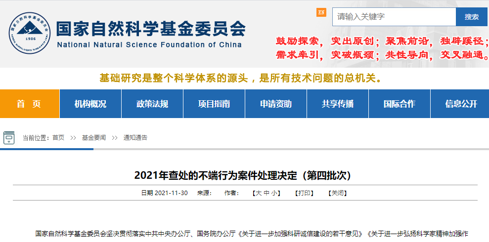 11月30日,国家自然科学基金委员会公布了2021年查处的不端行为案件处理决定(第四批次),将其中给予通报批评的5份处理决定(网络发布版)予以公布。