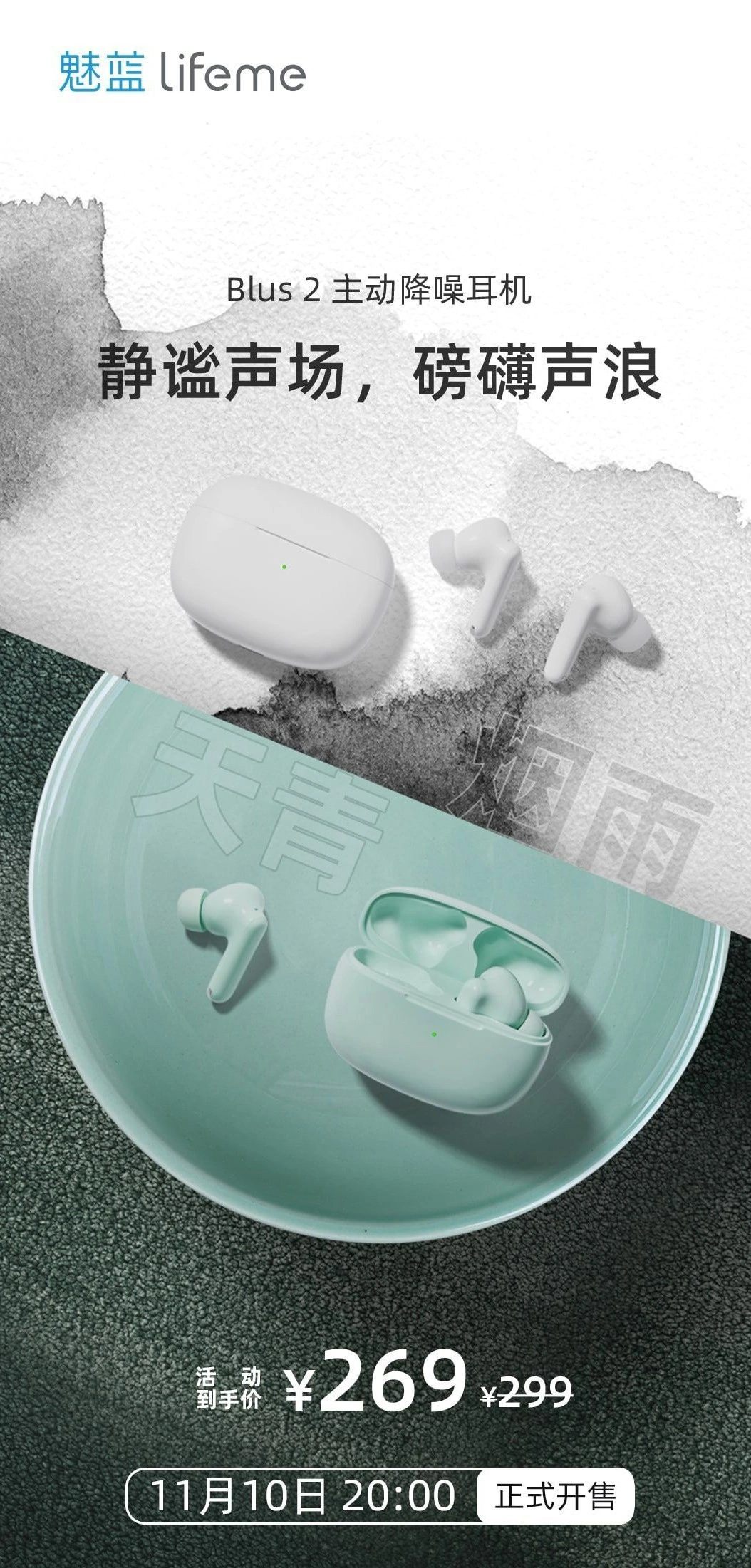 魅蓝今日发布了全新的 lifeme Blus2 主动降噪耳机“烟雨”配色,采用灰白外壳设计,整体看起来有点像陶瓷,该耳机活动到手价 269 元。魅蓝 lifeme Blus2 主动降噪耳机于今年 8 月首次发布,这款耳机采用了 12mm 分频超动圈,支持 IP5 级防水,支持无线充电,可提供 24 小时续航。它采用旗舰级的降噪配置,最高降噪深度 42dB,相比较魅蓝 blus 提升 50%。另外还配备了搭载独立 ENC 控制芯片的妙音双路四麦智能通话降噪功能。