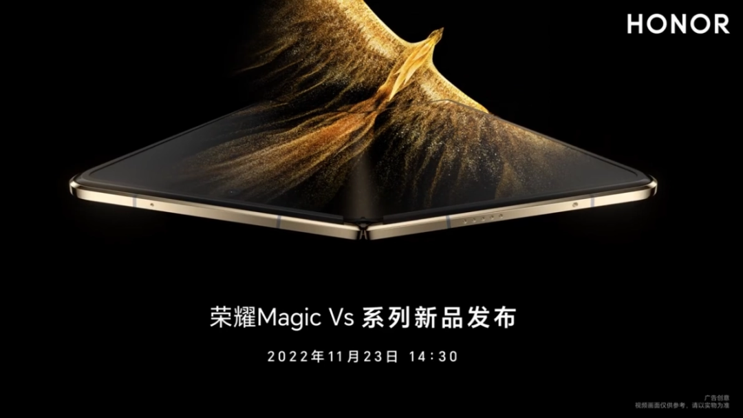 今天上午,荣耀官宣 11 月 23 日会发布新一代的荣耀折叠屏手机——荣耀 Magic Vs。预热视频中展现了荣耀 Magic Vs 依旧采用内折设计,配备了金色中框,机身展开后看起来非常轻薄。根据此前爆料,荣耀 Magic Vs 将搭载高通骁龙 8 + Gen 1 处理器,搭载 5000mAh 电池和 66W 快充,重量为 261g。