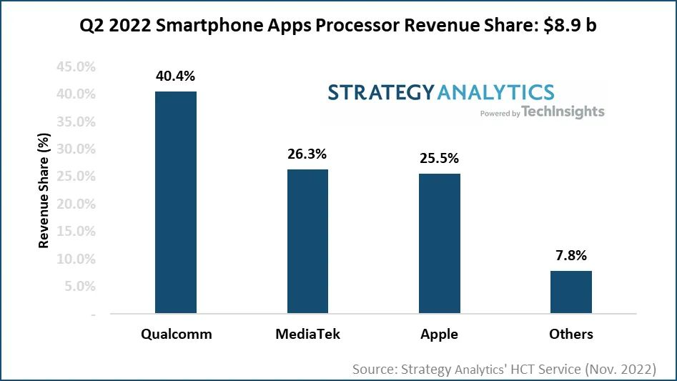 Strategy Analytics 手机元件技术(HCT)服务最新发布的研究报告《2022年Q2智能手机应用处理器市场份额追踪:高通创下历史新高》指出,全球智能手机应用处理器市场收益在 2022 年 Q2 增长 26%,达到 89 亿美元。高通、联发科、苹果、三星 LSI 和紫光展锐智能手机应用处理器市场收入份额排名前五。高通以 40% 的营收份额在智能手机应用处理器市场保持领先地位,其次是联发科(26%)和苹果(25.5%)。台积电制造了超过 80% 的智能手机应用处理器出货量,近几个季度,Samsung Foundry 的主要客户高通将订单转给了台积电。