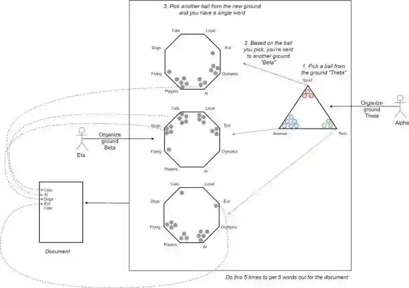 文档是如何生成的.首先,α(alpha)组织了地面θ(theta),然后你从中挑出一个球.根据你的选择,你被送到了地面β(beta),β由η(Eta)组织.现在你从β中选择一个词,并将其放入文档.你迭代这个过程5次,得到5个词.