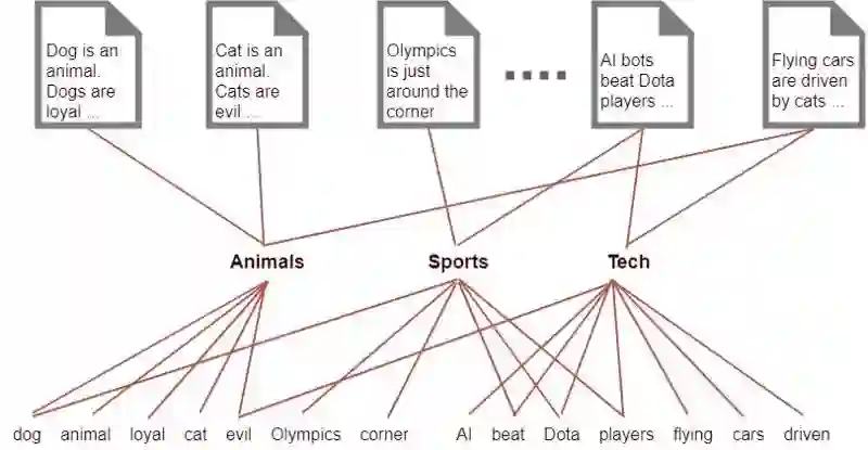 注意:我这里使用的主题(“Animals”, "Sports","Tech")是虚构的,真正的求解结果如使用(0.3*Cats, 0.4*Dogs, 9,0.2*Loyal,0.1*Evil)表示“Animals”这个主题,即如前所述,每篇文档为单词的分布。