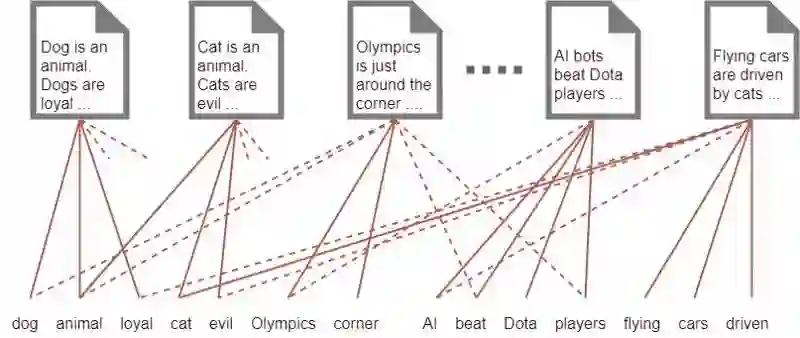 比如你有1000个单词的集合(即所有文档中最常见的1000个单词)和1000份文档。假设每份文档平均有500个单词出现在这些文档中。你怎么知道每篇文档属于哪个类别?一种方法是将每篇文档使用一根线连接到每个出现在文档中的单词,如下图所示: