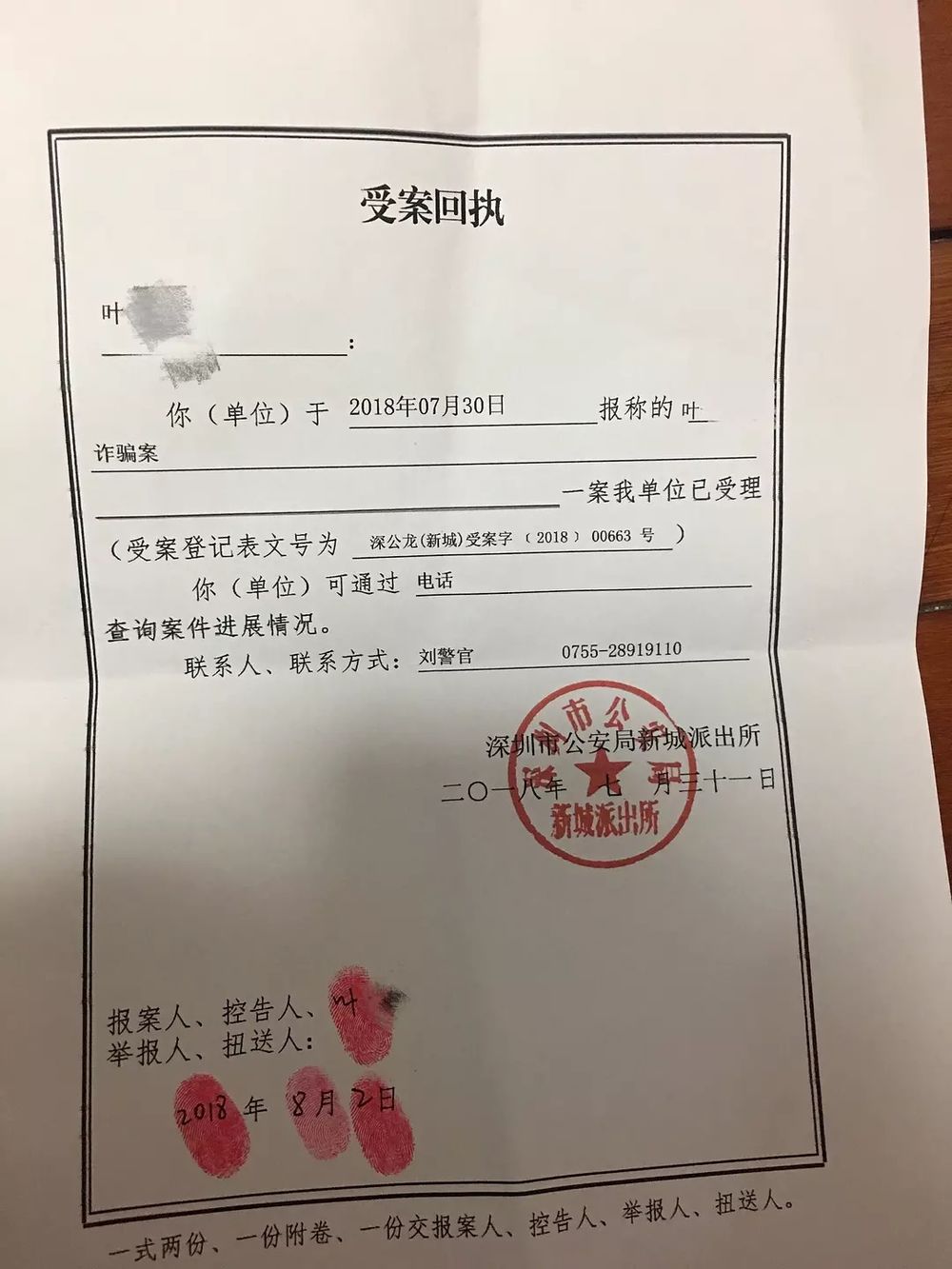 “独钓寒江雪”应该是8月2日拿到了深圳市公安局新城派出所的受案回执,显示姓叶(以下称叶女士):