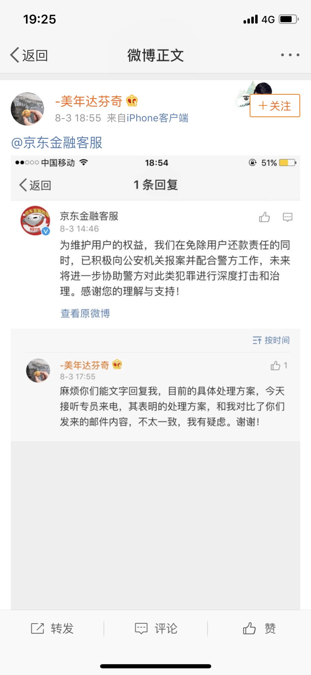 就在8月3日晚上19:25,我看她在半个小时前发了条微博(账号:-美年达芬奇),她似乎对京东免除她的还款责任还有疑虑,而京东方面上午已经告知她免除她的还款责任了。
