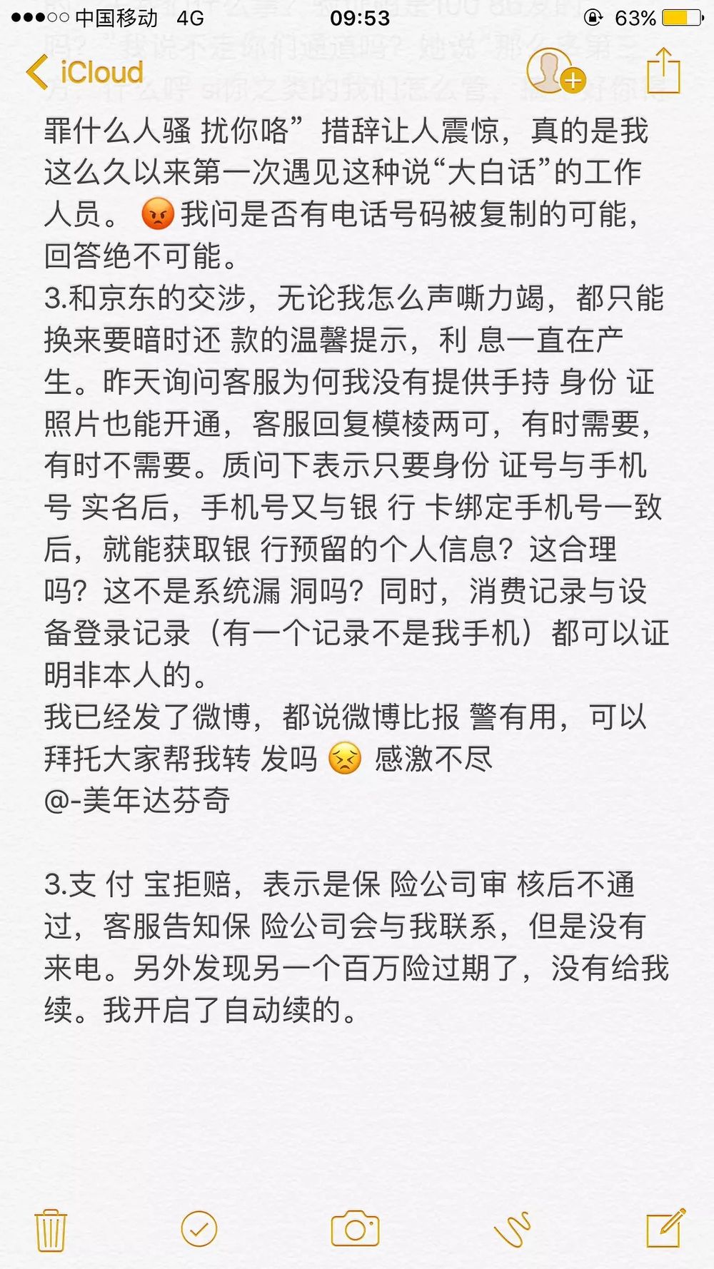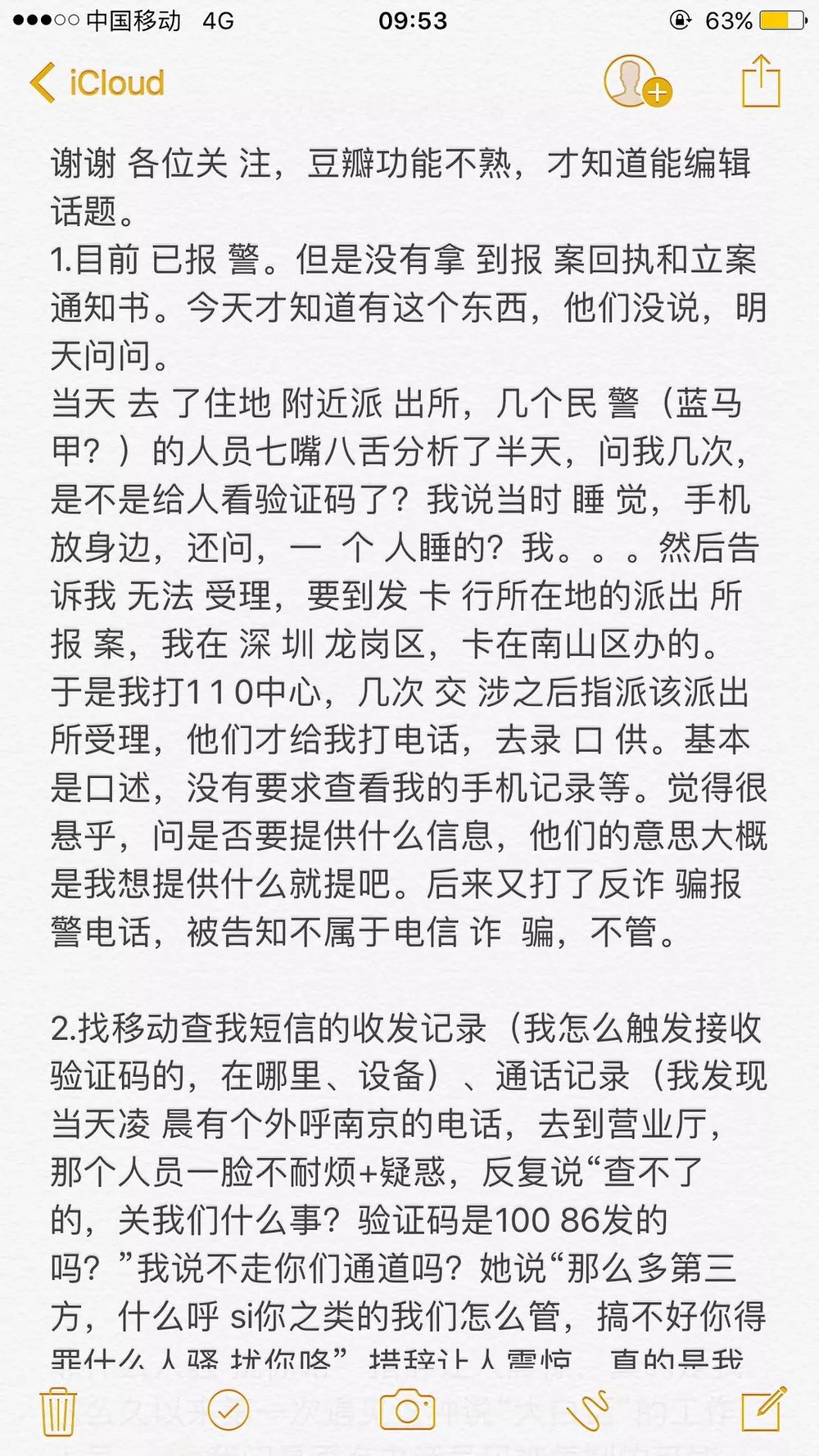 毕竟是财产丢失,加上对个人信息泄漏的恐惧,“独钓寒江雪”说她现在“巨难过”。她这两天陆陆续续补充了一些最新进展,记录在了iPhone备忘录里: