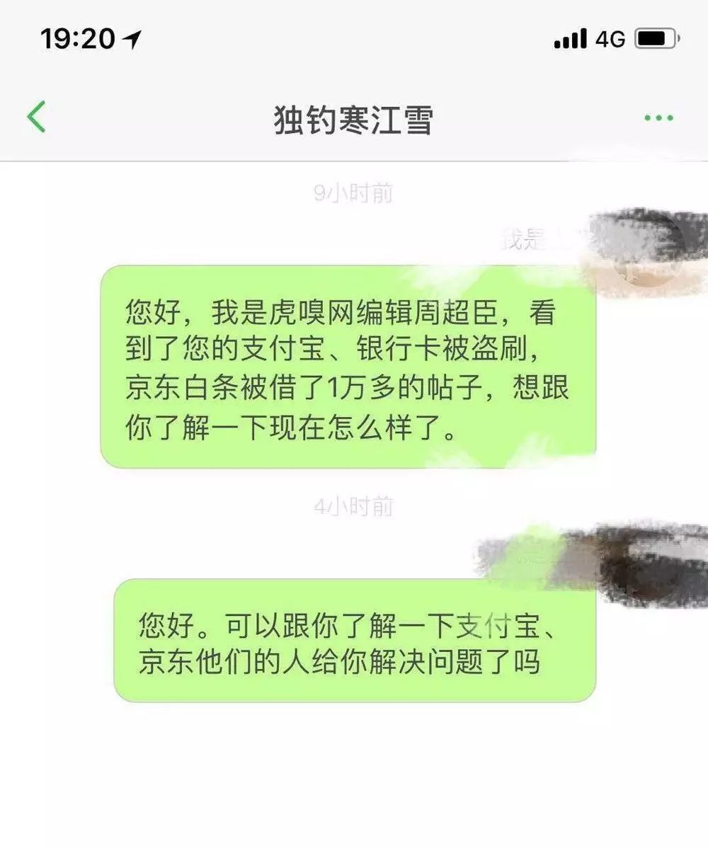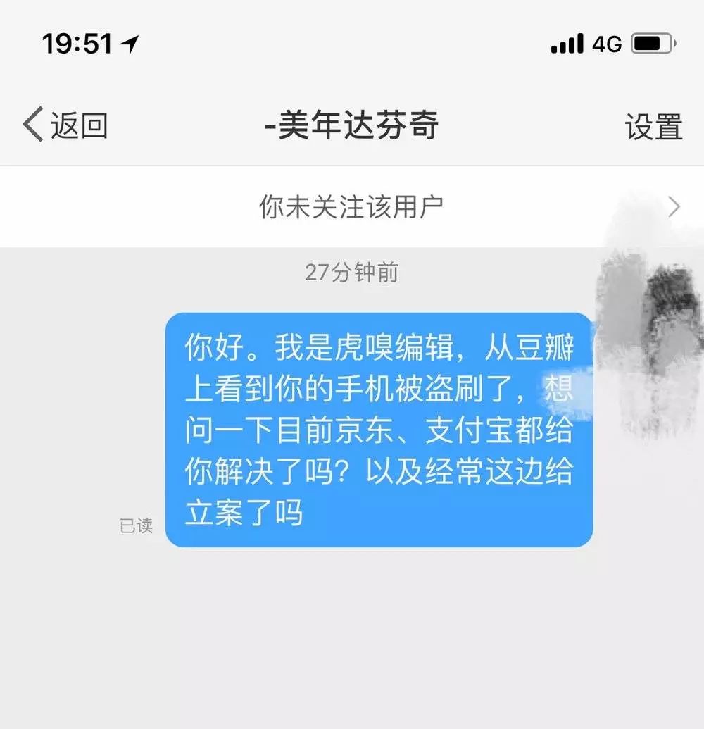 随后,我给她微博发了私信,问她京东、支付宝方面是否已经对其进行了赔付处理,以及警方是否已经立案调查。微博显示对方已读,但截至发稿,对方未给予回应。