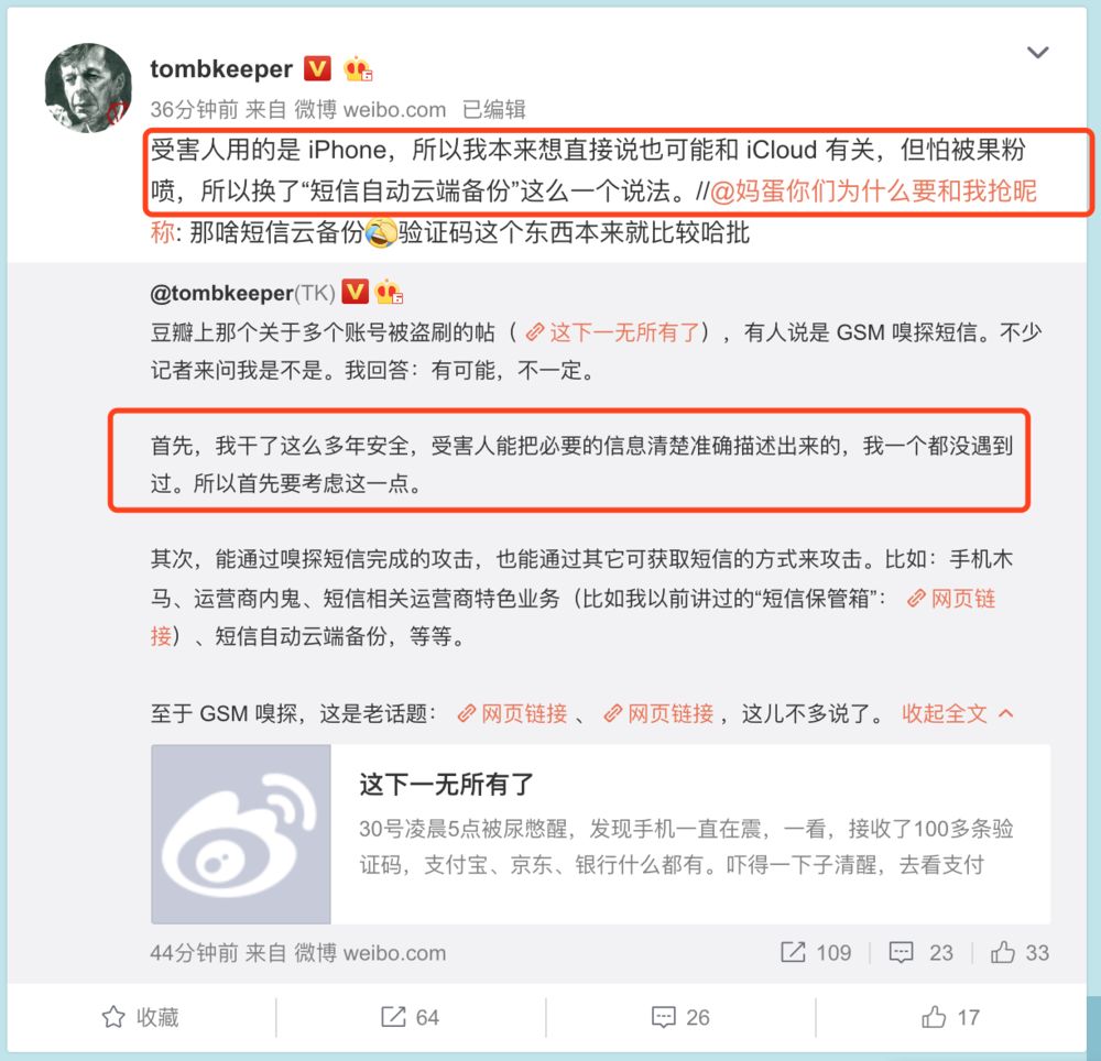 TK补充说:“受害人用的是iPhone,所以我本来想直接说也可能和iCloud有关,但怕被果粉喷,所以换了‘短信自动云端备份’这么一个说法。”