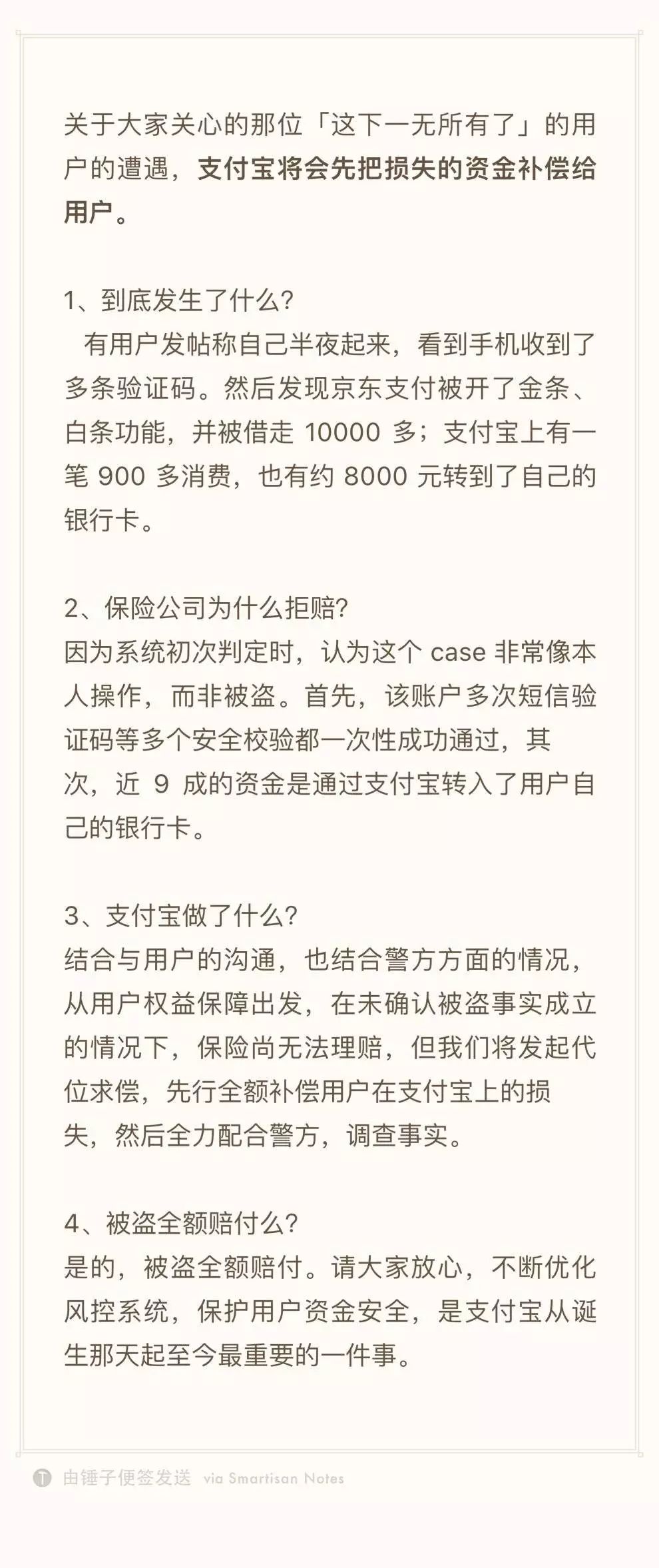 支付宝这边说:“了解到这个事情后,我们昨天凌晨(8月1日,也就是豆瓣帖子发出来的那个凌晨)成立了小组,正在追查这个case,查一查被盗刷原因以及拒赔的理由。”